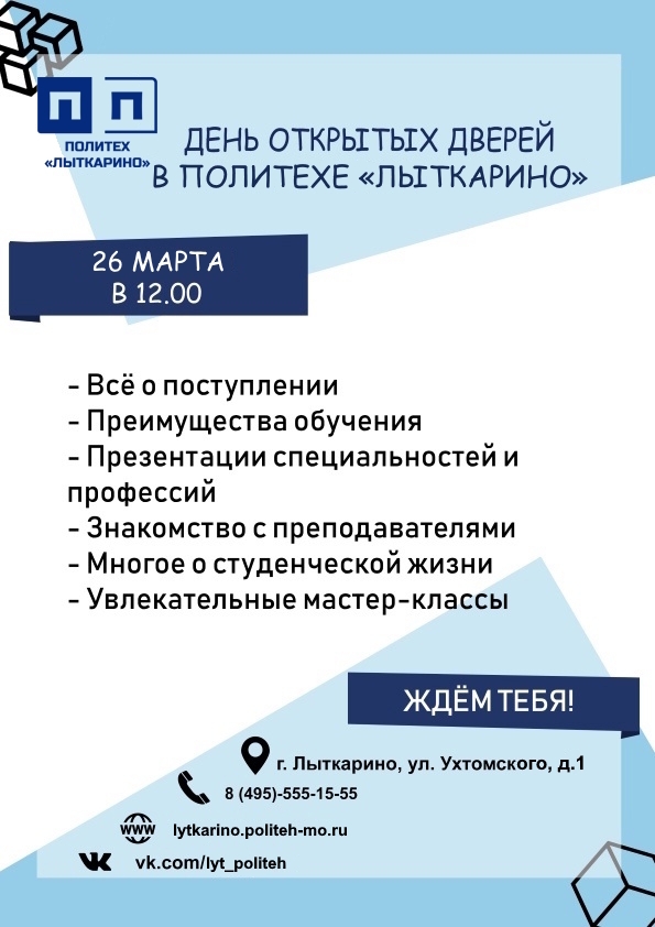 Политех «Лыткарино» приглашает тебя и твоих друзей на День открытых дверей! 26 марта в 12.00 филиал «Лыткарино» Подмосковного политехнического колледжа радушно встречает своих будущих студентов и их родителей.Наших гостей мы, по традиции, удивляем, радуем, информируем об актуальном в условиях поступления и обучения.Политех «Лыткарино» подготовил зрелищные мастер-классы по направлениям профподготовки и не только…Приходите. Вам у нас … Читать далее