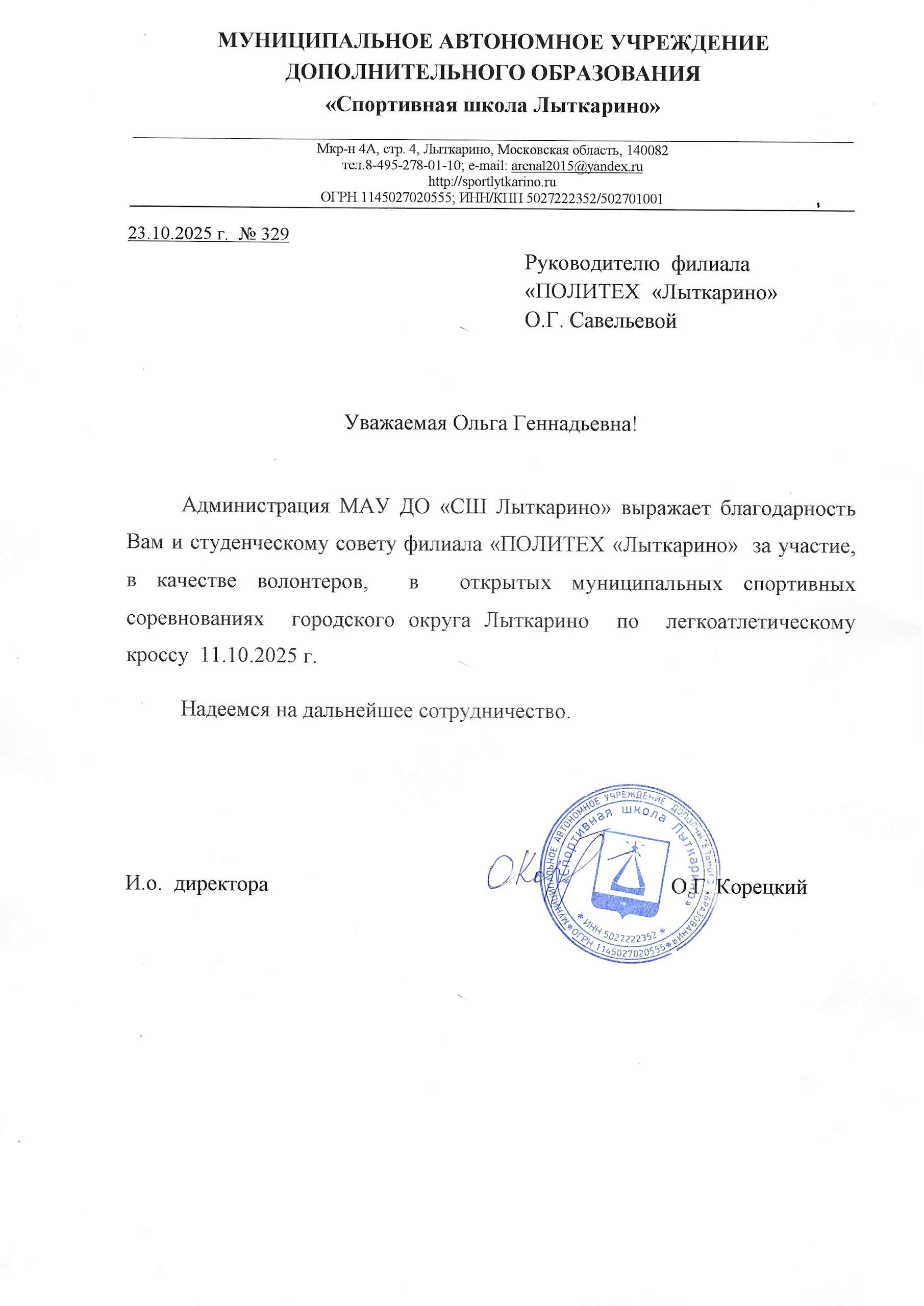 Спортшкола Лыткарино благодарит Политех «Лыткарино» за содействие в организации спортивных событий 24.10.2025 от ppklyt.priem